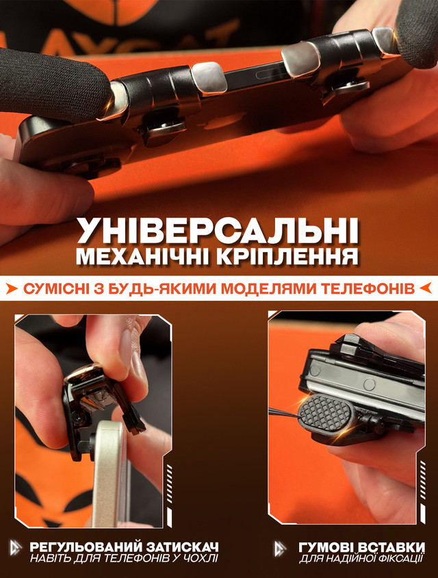 Універсальне кріплення з антиковзною гумовою вставкою надійно фіксує тригери на корпусі смартфона, не дозволяючи їм зміщуватися або «їздити» під час гри. Силіконові вставки з переднього боку захищають екран і не пошкоджують захисне скло чи плівку.